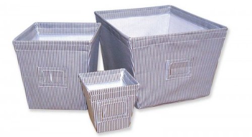 The Yacht Club Fabric Storage Bins are trendy and fun, offering storage and organization to any space without sacrificing style! This set of three fabric bins is great for nursery decor and as baby storage baskets, ideal for holding toys, diapers, dirty clothes, bath supplies and much more in the nursery or playroom. With a stylish yacht club striped print cotton design, these decorative baskets can be used in other areas of the home as well, including the office, closet and kitchen for additional storage and organization. Liners are removable for easy cleaning. Small Bin: 6" x 6" x 6" Medium Bin: 10" x 10" x 10" Large Bin: 14" x 10" x 18" Assembly level/degree of difficulty: No Assembly Required. Read more...