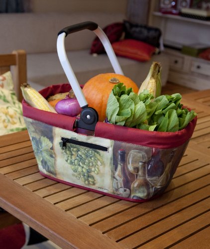 Clumps of grapes still cling to the vine, surrounded by lush greenery, scenes of the vineyard, as well as bottles of wine. The wine collage on this market basket is stunning and sophisticated, richly colored and boldly handsome. Why use plastic bags, when you can go to the market or grocery store with your own eco-friendly basket? Read more...