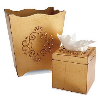 Our Scroll Waste Basket is from the Bellino collection by Labrazel, renowned maker of premier bath accessories. This waste basket is crafted from the finest materials to lend elegance to your bath. Handcrafted scrollwork on glass and wood is key to this collection's rare beauty.Finely embossed gold or silver garlands detail the hand-blown glass tumbler, soap dish, dispenser, and jar. The tissue box and wastebasket, sculpted of wood, are adorned with hand-applied gold or silver leaf scrollwork. An opulent addition to your master bath. Handcrafted in Italy. Read more...