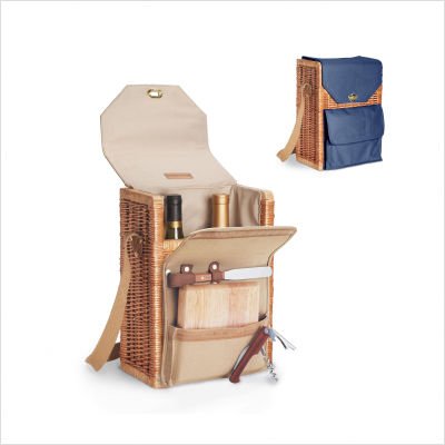 120-04 Convenient and practical, the Corsica picnic basket is perfect for wine and cheese lovers, picnics, concerts and travel. Made from willow and fully lined with canvas, this easy to carry two-bottle wine basket provides great insulation. The upright position makes it very easy to store all of your wine and cheese necessities. The cheese knife, cutting board, and a corkscrew are all included which makes this picnic basket a wonderful gift idea! Features - 2 Compartments for wine bottles - Stainless steel waiter-style corkscrew - Hardwood cutting board (6'' x 6'') - Stainless steel cheese knife with wood handle - Insulated wine and cheese basket - Adjustable shoulder strap makes it easy to carry Specifications - Basket materials: willow and polyester canvas accented with leather - Color: tan / gold basket lining - Weight: 5 lbs - Overall dimensions: 14'' H x 9.5'' W x 4.5'' D Read more...