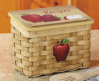 Adorable table or countertop storage for your recipe cards. Charming wood woven basket with apple medallion and handpainted lid. No recipe cards included Read more...