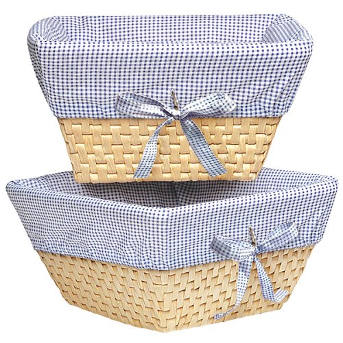The perfect nursery basket - useful, stylish, and versatile! These woven maize husk baskets are "softer" than traditional wicker baskets and gentler on wood furniture. Ideal for storing and organizing diapers, clothes, diapering supplies, toys, books, and more. Particularly handy when used on or near your changing table in the nursery. Use them anywhere around the house - in closets and cabinets, too! Set includes: two natural baskets and two navy gingham liners. This basket set makes a wonderful baby shower gift. Removable liners fully line and protect the interior of the basket. Each generously sized, natural color basket measures approximately 15"L x 15"W x 8"H. Fabrics parts are made of a poly/cotton blend and can be machine washed cold, gentle cycle, and tumble dry low or air dry. Actual colors/patterns may vary slightly from screen display. Toys and accessories shown with the baskets are not included. Due to their handmade nature, baskets may vary from shown. They may be more or less tapered at the bottom and/or vary slightly in size, but overall size is generally 15"Lx15"Wx8"H. Read more...