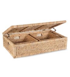 Natural Woven Under Bed Storage Basket with Two Removable Organizing Inserts. This natural woven, hinged Under Bed Storage Basket is pretty enough for display, but it fits nicely under your bed to store linens or off-season clothes and shoes. It even comes with two removable inserts with handles that can be used for interior organization or for attractive display and storage around your home. Three great baskets in one! Poly/cotton liner. Imported. Size 30"W x 17"D x 8"H inserts are each 14" sq. x 5"H Read more...
