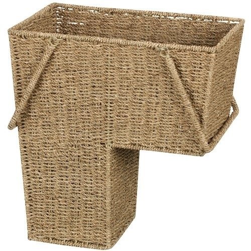 This Stair Step Basket Seagrass Large w/ Carrying Handle - Household Essentials #ML-5647 prevents tripping over stuff on your stairs. Collect it neatly in this naturally beautiful Seagrass Stair Basket. Its unique design keeps it steady and firmly situated on your stairs while you fill it with the day's accumulation of odds and ends. Have one for each member of the family and watch the accumulated clutter of daily living disappear. Perfect for laundry day, books, and other migrating things, this two-handled basket makes the stuff-of-life less of an eyesore-and putting it back less of a chore