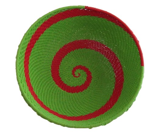 Gorgeous Hand Woven Green & Red African Zulu Telephone Wire Basket. Handmade in Africa, these striking telephone wire woven baskets in bright colors are the signature mark of contemporary Zulu handicraft. They are both elegant and charming, making them a lovely home décor gift. Known as imbenge baskets, the Zulu believe they add pride, warmth and dignity to a home. We couldn't agree more. Whether you use them as a bright decor accent or for serving nuts and crackers, they offer a startling burst of color and simple design. The basket weaving tradition in Africa originally called for grasses and natural fibers. As those materials came into short supply, the weavers began using colorful telephone wires in their place.Each weaver creates their own designs - some traditional, others more contemporary. We happen to love the beautiful simplicity of these spiral designs in brilliant colors. Baskets measure 6" diameter, 2.5" tall. Baskets are not sealed to hold liquid, rather feature an open weave. To clean, rinse with soap and water. Read more...