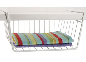 Maximize the available storage space in any cabinet or closet with a Under Shelf White Wire Storage Basket. This handy kitchen cabinet organizer simply slides onto a shelf measuring up to 3/4" thick and provides a wire mesh basket ideal for storing extra kitchen towels sandwich bags coffee mugs canned goods and more. 12 Inch Under Cabinet Shelf Organizer Features Heavy duty wire construction with a clean white finish. Storage basket arms simply slide onto a shelf and fit neatly on shelves measuring up to 3/4" thick. Kitchen cabinet basket offers usable storage space measuring 10" wide x 4" high x 9.5" deep. Helps maintain a more neat and organized kitchen cabinet and utilize otherwise unused available storage space. Cabinet organizer is great for holding extra kitchen towels canned goods boxes of plastic wrap and much more. Can also be used to store clothing accessories in a bedroom closet hand towels in a linen closet or even envelopes and office accessories under a desk. Read more...